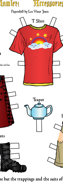 This paper doll, originally published in 2013, was born of a long standing Hamlet obsession that came to pass after the making of a larger mixed media piece of Hamlet as a playing card. The idea of cheering him up by playing dress up only went further by Hamlet becoming a humor project on twitter for a time.